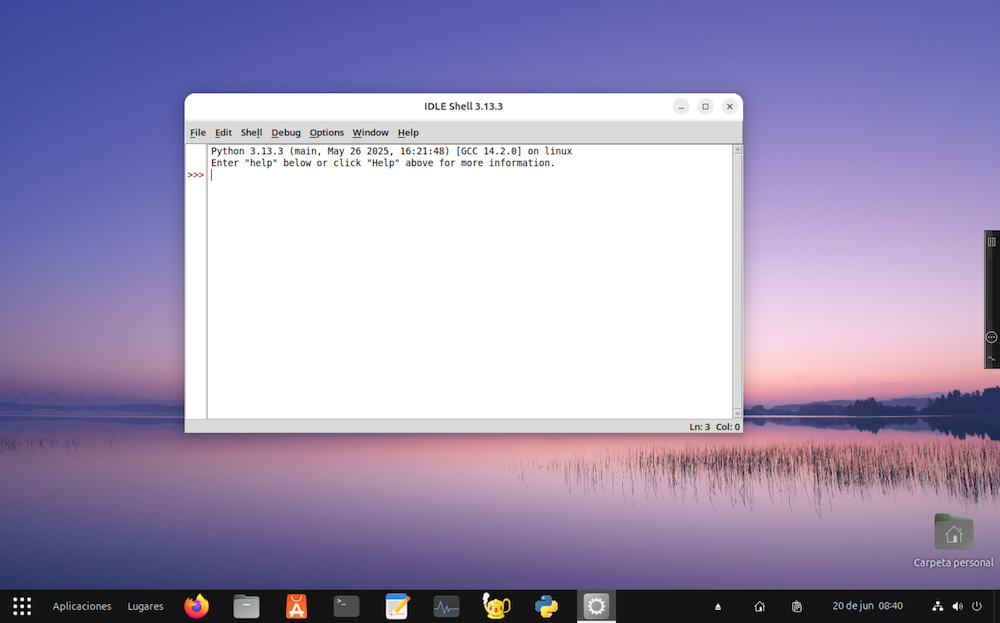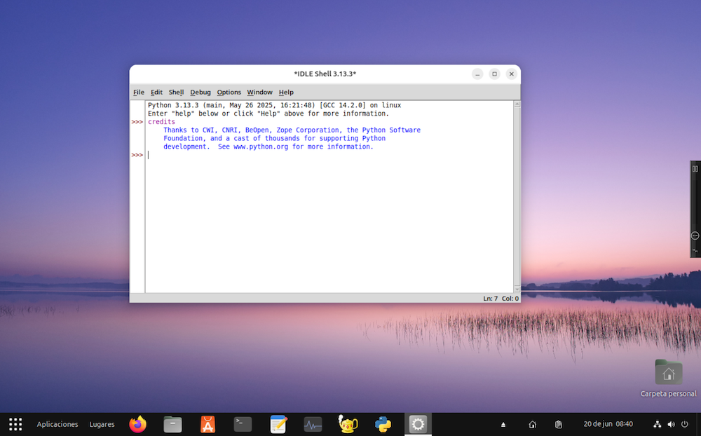 A esta ventana se le llama shell. El área de trabajo muestra inicialmente un mensaje que indica la versión del intérprete de Python que tenemos instalada: