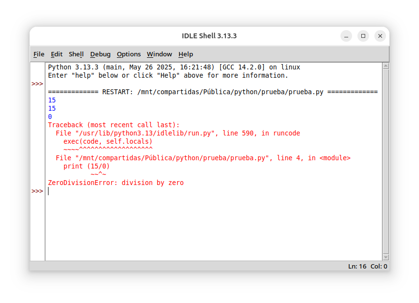 ZeroDivisionError: division by zeroUna división es una operación equivalente a hacer un reparto. ¿Se puede repartir 15 unidades entre cero personas? No hay reparto. Dividir un número entre cero no siempre es una buena idea.