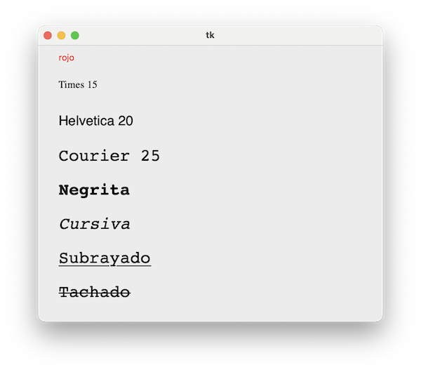 lienzo.create_text(30,350, text="Tachado", anchor="nw", font=("Courier",25,'overstrike'))