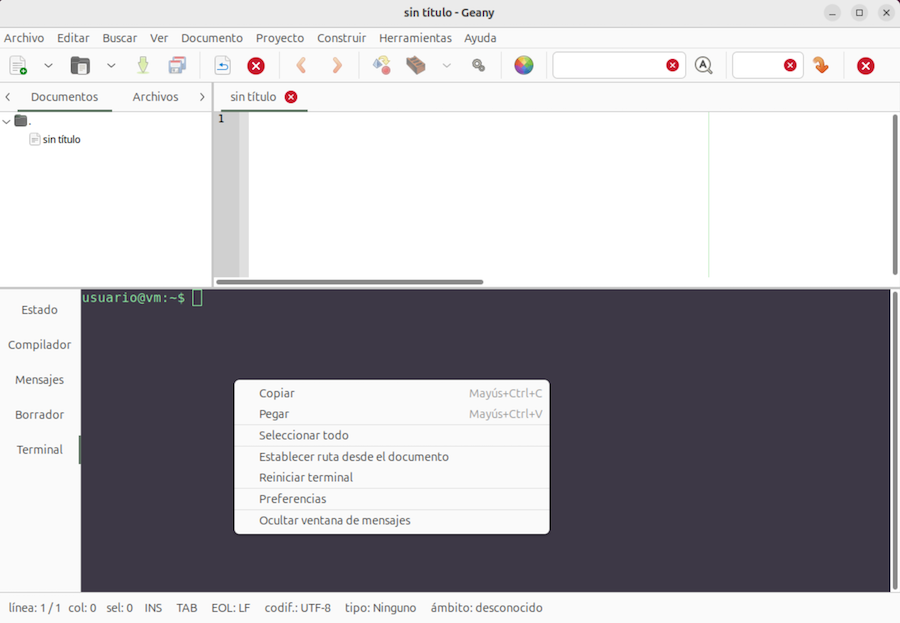 Podemos usar la VTE para introducir y ejecutar comandos del sistema operativo. Cuenta con opciones de copiar y pegar, y un men煤 desplegable de acciones pulsando con el bot贸n secundario del rat贸n: