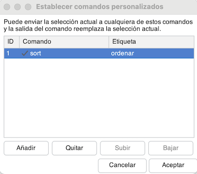 Seleccionamos un texto a convertir, pulsamos en el men煤 Editar > Formato > Enviar texto seleccionado a... y pulsamos sobre nuestro comando "ordenar". Las l铆neas del bloque de texto se ordenar谩n por orden alfab茅tico.