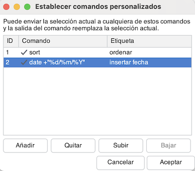 Si no hay una selecci贸n de texto previa, se utiliza toda la l铆nea actual en su lugar. Por ejemplo, para insertar la fecha actual en el documento, creamos un comando "insertar fecha" con el texto: