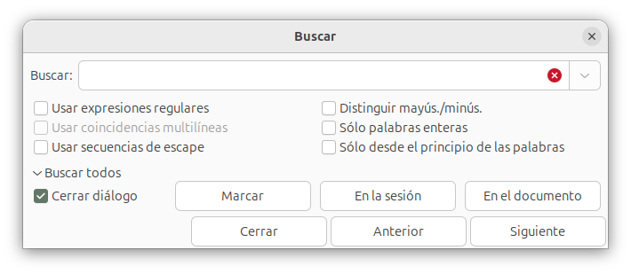 Podemos seguir editando el texto con la ventana de diálogo abierta. La ocultamos con el botón [Cerrar]. Se puede configurar para que se cierre automáticamente al pulsar en los botones siguiente/anterior. Se hace con el menú Editar > Preferencias > General > Varios > Buscar > Ocultar diálogo de búsquedas.