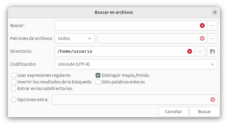 La opción de menú Buscar > Buscar en archivos muestra una ventana de diálogo para buscar texto en todos los archivos de un directorio:
