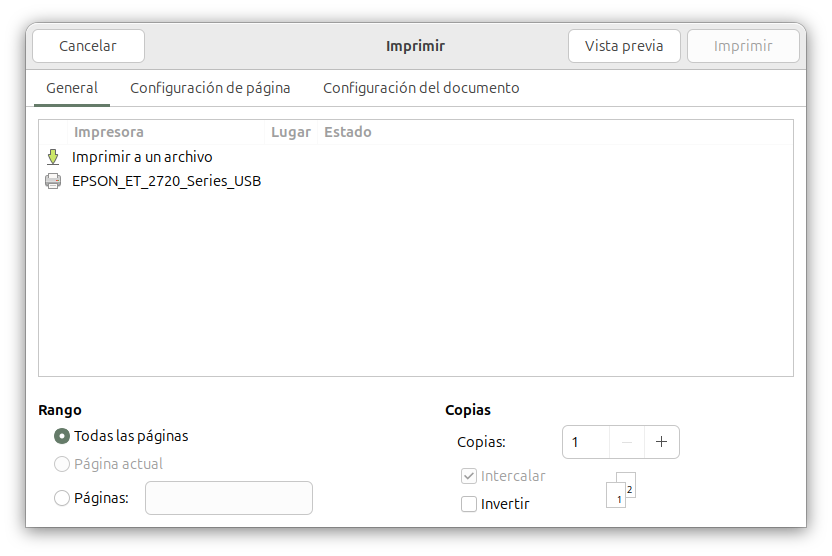 En la ventana de di谩logo podemos establecer si queremos imprimir todo el documento, una p谩gina concreta o un rango de p谩ginas.