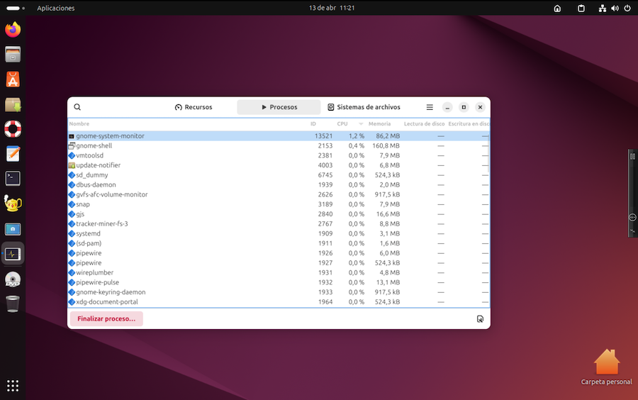 En la siguiente imagen tenemos un monitor del sistema ejecutándose en una ventana sobre un escritorio de Linux. Podemos ver la lista de procesos, los recursos consumidos por cada uno, y en caso de que la máquina se quede bloqueada, detectar cual es el programa que está acaparando el tiempo de la CPU.