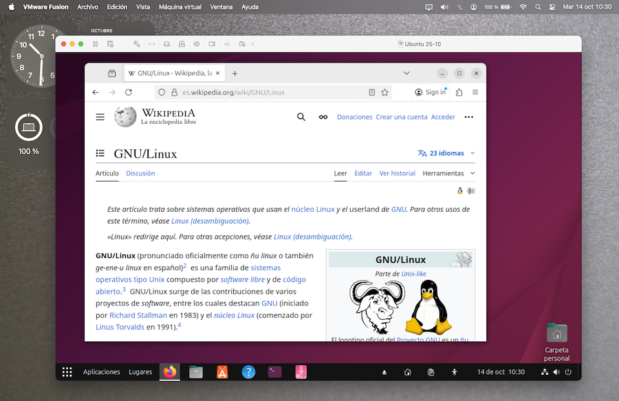 En la siguiente imagen tenemos una máquina virtual Linux sobre el escritorio de mi ordenador Mac: