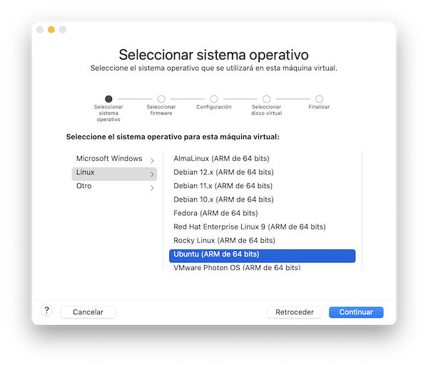 Pulsamos en Crear máquina personalizada. Seleccionamos el sistema operativo, Ubuntu para arquitecturas ARM de 64 bits (los chips de Apple):