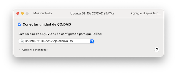El primer paso es asegurarnos de que el pendrive virtual de instalación de Ubuntu está siendo detectado por la máquina virtual. Para ello accedemos a la configuración, apartado CD/DVD, y nos aseguramos de ello, como vimos en el apartado anterior.