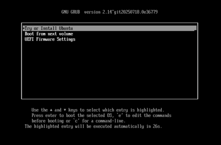 Ahora ya podemos poner en marcha la máquina virtual. Acudimos a la ventana de biblioteca de máquinas virtuales, seleccionamos la que hemos creado y pulsamos en el menú de VMWare "Máquina Virtual > Arrancar". El sistema acude al DVD virtual, busca el programa de arranque, y lo ejecuta. Lo que se visualiza es lo siguiente (para un sistema Linux Ubuntu):