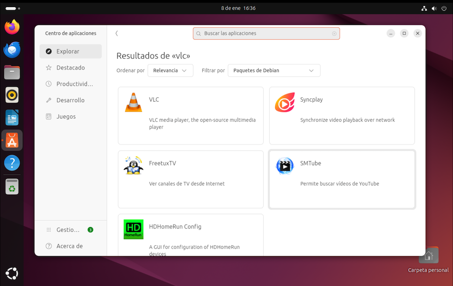 Nótese que se nos mostrará la opción de buscar en el repositorio de Debian (heredado por Ubuntu) o en la tienda de Snaps de Ubuntu.
