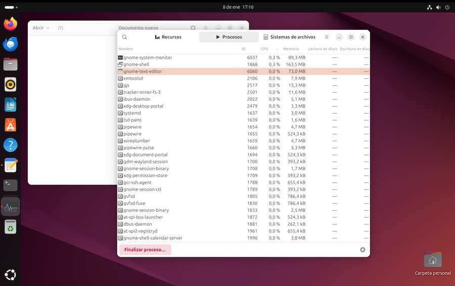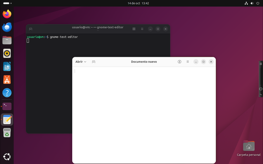 En principio, los programas se ponen en marcha tecleando su nombre y pulsando Enter. Por ejemplo, el editor de textos suministrado por el escritorio Gnome se llama gnome-text-editor: