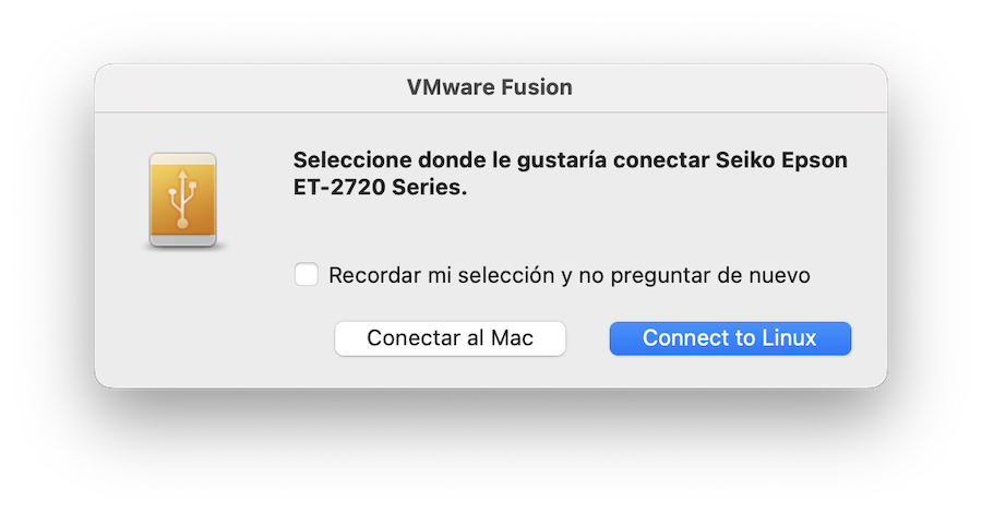 Como sucede con los discos externos, al conectar una impresora a un puerto USB, esta ser谩 detectada en el momento de conectarla y encenderla. Se nos preguntar谩 si queremos conectar la impresora como dispositivo de la m谩quina f铆sica o la virtual: