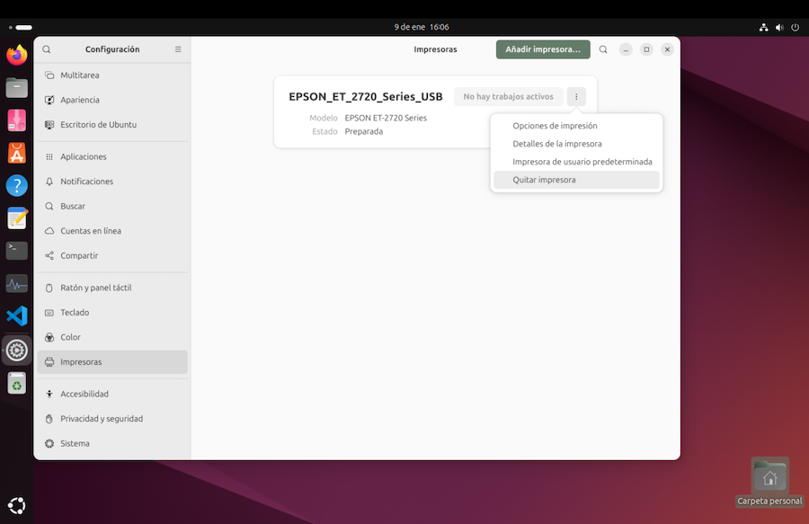 Pulsando en Configuraci贸n, apartado Impresoras, podemos ver el estado de la impresora, y desconectarla, llegado el caso.