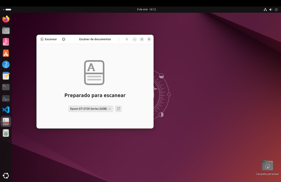 Muchas impresoras son multifunci贸n, e incorporan la posibilidad de escanear documentos. Si hemos conectado el dispositivo, para usarlo como escaner debemos iniciar el programa Escaner de documentos, en el men煤 de aplicaciones. Comienza detectando los dispositivos conectados, y seguidamente muestra el espacio de trabajo: