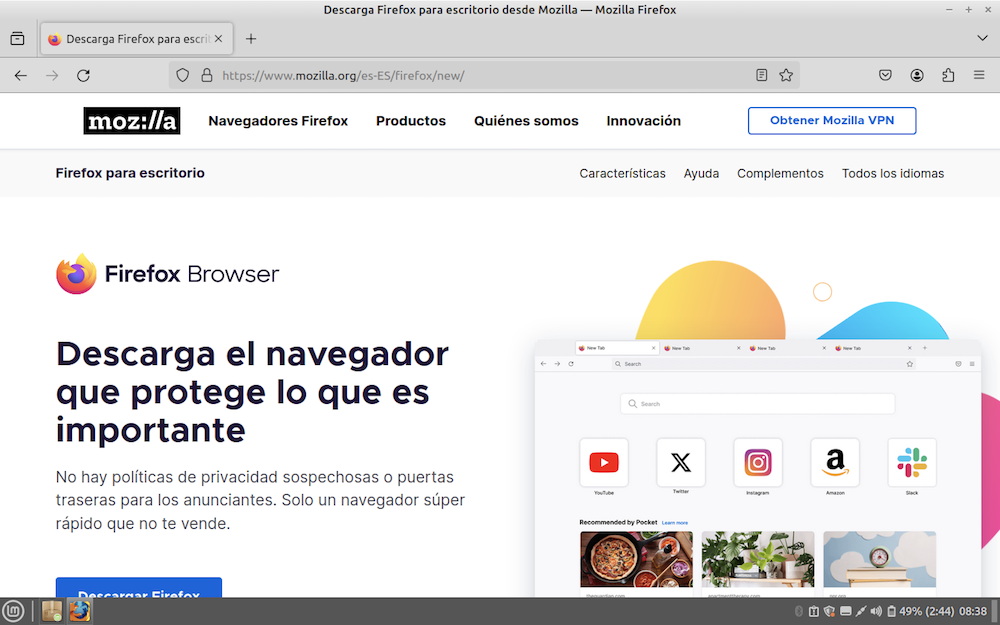 Ubuntu incluye de serie el navegador Mozilla Firefox. Su p谩gina web es https://www.mozilla.org/es-ES/firefox/.